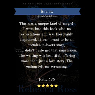 Review: This was a unique kind of magic! I went into this book with no expectations and was thoroughly impressed. It was meant to be an enemies-to-lovers story, but I didn't quite get that impression. The writing was beautiful, offering more than just a love story. The ending left me screaming.
