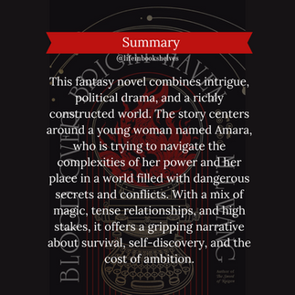 This fantasy novel combines intrigue, political drama, and a richly constructed world. The story centers around a young woman named Amara, who is trying to navigate the complexities of her power and her place in a world filled with dangerous secrets and conflicts. The book weaves together themes of loyalty, betrayal, and the consequences of power. With a mix of magic, tense relationships, and high stakes, it offers a gripping narrative about survival, self-discovery, and the cost of ambition.